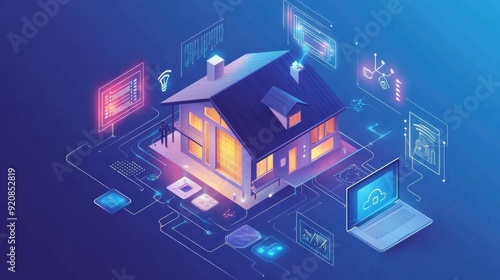 Illustration Of A Smart Home With Interconnected Devices And Cloud Technologies, Set In Digital Blue Artwork.