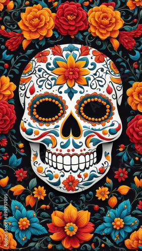 Illustration of a Traditional Mexican Day of the Dead celebration festive colors patterns