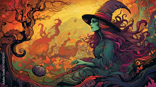 Illustration of a witch in halloween in colorful tones