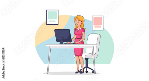 Illustration of a woman working on a computer in a modern office, perfect for websites or marketing materials.