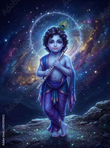 Illustration of krishna with flute and peacock feather in a starry night with glowing halo around him