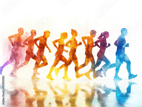 Illustration of people running working out in colourful spectrum with white background