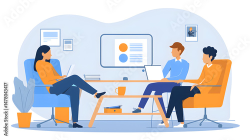 Illustration of three people in a meeting room with laptops and a presentation screen on the wall