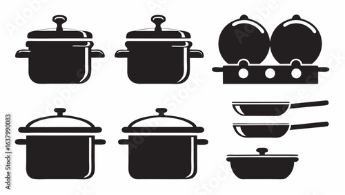 Illustration of various cookware items including pots pans and a waffle iron in black and white style | editable eps vectors silhouette