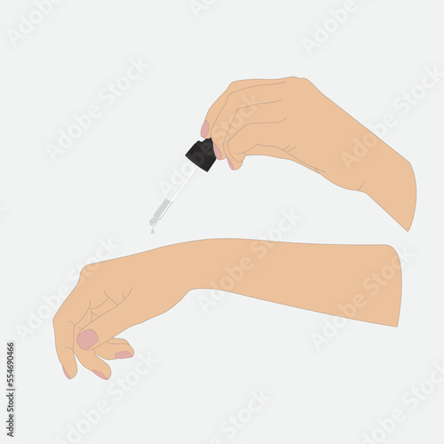 Illustration of woman's hands with serum pipette. A drop of liquid is dripping from a pipette.