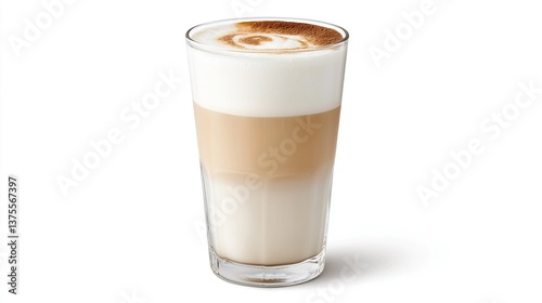 Illustrative glass of latte with milk and cream topping, against white background, high resolution, product poster, brim-filled coffee, layered contrast, symmetrical composition, focus on foam, overhe