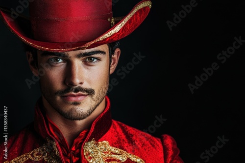 Image of a performer in a red outfit and hat against a dark backdrop