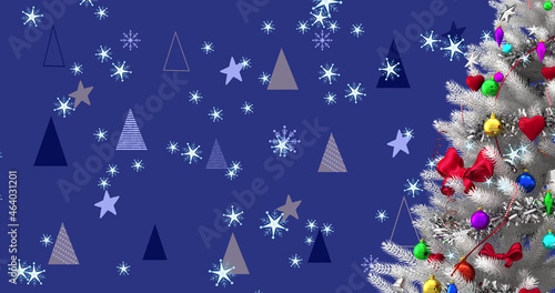 Image of christmas tree over christmas tree pattern on blue background