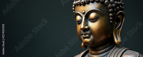 Imposing bronze Buddha statue, serene expression, intricate details, Lantau Island, shadow