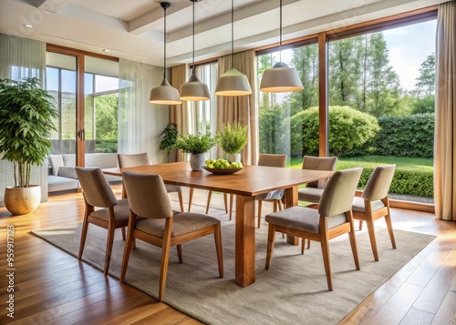 In a bright and airy room, a stylish wooden dining table and chairs bring warmth and sophistication, ideal