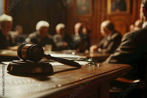 In a courtroom a jury delivers a sentence with a gavel. Concept Courtroom, Jury, Sentence, Gavel, Legal Proceedings