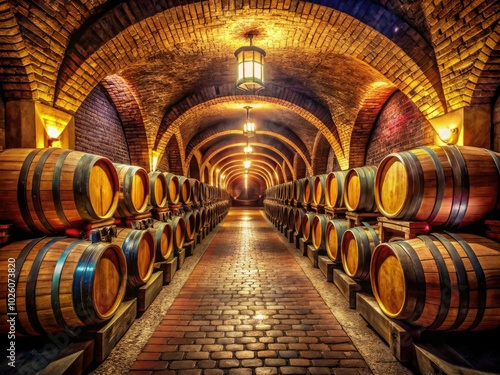 In a cozy ambiance, the wine cellar glows warmly, adorned with oak barrels and a rustic brick pathway, elegantly honoring the rich tradition of winemaking.