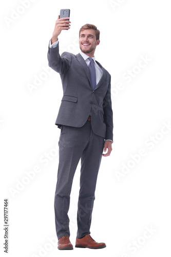 in full growth. smiling businessman taking selfie.