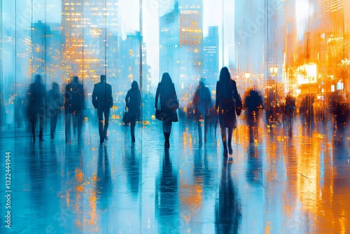 In the business center's lobby, a group converses amidst the blue-toned ambiance