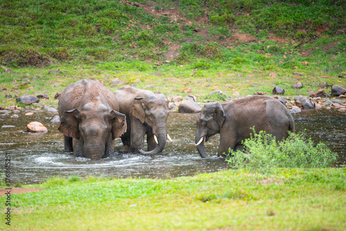 Indian elephants, wild herd taking a bath at waterhole, Anakulam near Munnar, wildlife of India, elephant family at a rainy day