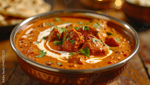 Indian famous Butter Chicken served with Fresh cream garnished with Cilantro and Cream Swirls, Served Hot in a Traditional Metal Dish with butter Naan and Rice in the Background.