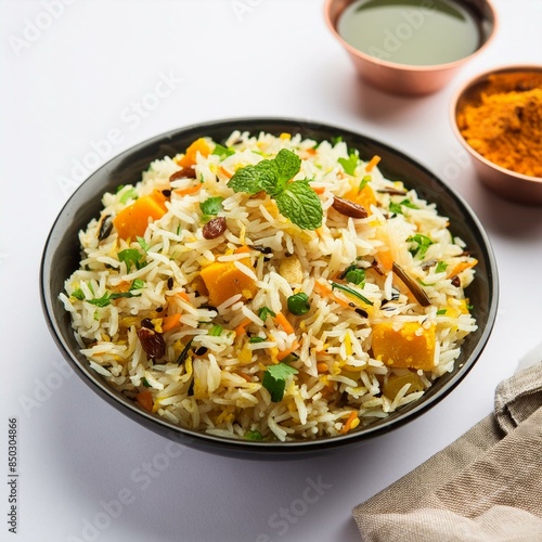 Indian food veg biryani or veg pulav isolated on white background