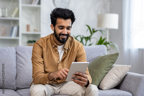 Indian man smiles while browsing on a tablet, comfortably seated on a sofa in a well-lit modern apartment living room.