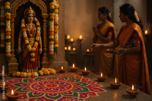 Indian women lighting oil lamps in front of goddess lakshmi statue during a hindu religious ceremony