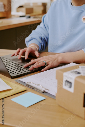 Individual working on laptop in organized office environment with various papers and stationary around workspace contributing to productive atmosphere without distraction