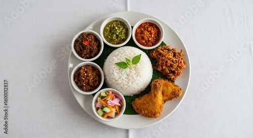 Indonesian Nasi Campur: Rice with Condiments and Fried Chicken