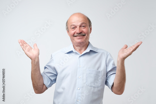 Indoor portrait of confused senior man in blue shirt showing I have no idea gesture