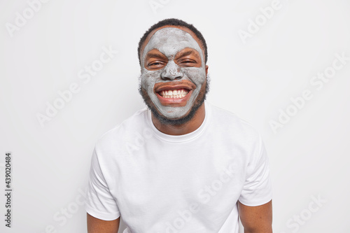 Indoor shot of joyful Afro American man grins at camera shows white teeth applies clay mask for skin care dressed casually poses indoor. Men beauty treatments wellness and rejuvenation concept