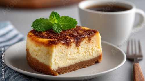 Indulgent Cheesecake Moment: a delicious slice of cheesecake, adorned with a sprig of mint, alongside a steaming cup of coffee, inviting viewers to savor a moment of sweet pleasure.