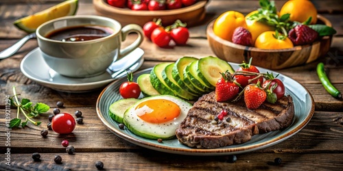 Indulgent Low Light Breakfast: Steak, Eggs, Avocado, Fresh Fruit, and Coffee in Cozy Setting