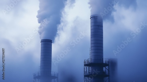 Industrial chimneys release thick plumes of smoke into the blue haze of the sky, contrasting humanity’s industrial efforts against nature’s vastness.