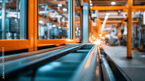 Industrial Minimalist Robotic Welding Line with Steel Beam and Sparks