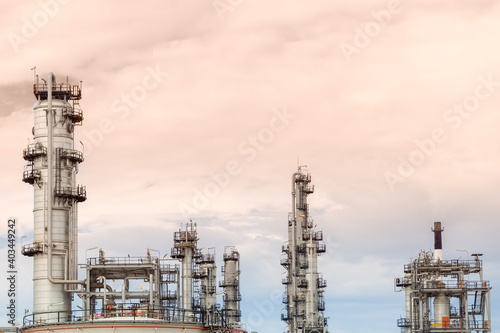 Industrial of oil refinery plant from industry zone ,Refinery factory oil storage tank and pipeline steel with sunset sky.
