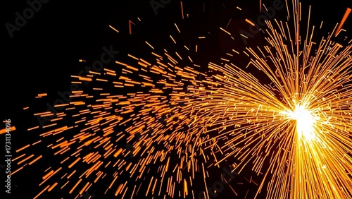 Industrial scene with glowing orange sparks in motion against dark background, metalworking abstraction.