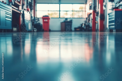 Industrial Workshop Interior with Clean Floor and Tools in Background