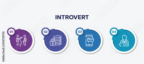 infographic element template with introvert outline icons such as interviewer, encrypt, mms, charged vector.