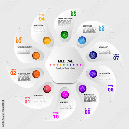 Infographic Medical template. Icons in different colors. Include Venerology, Anesthesiology, Oncology, Gynecology and others.
