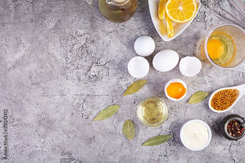 Ingredients for mayonnaise. Delicious homemade mayonnaise with ingredients for sauce. Healthy homemade food. Top view