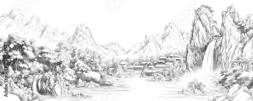 Ink Wash Landscape of a Mountain Village