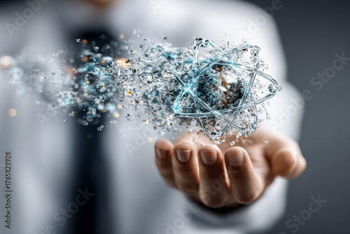 Innovation and science concept with scientist holding glowing atom model symbolizing research, technology, energy and futuristic scientific discovery