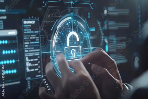 Innovative digital security concept featuring a hand interacting with a futuristic touchscreen displaying a glowing padlock icon in a high tech environment
