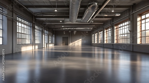Inside Empty Industrial Warehouse Space with High Ceilings and Large Windows