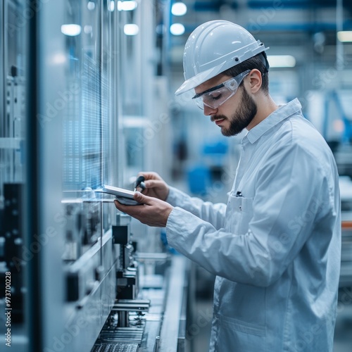 Inspector using digital tools to check product measurements on a factory floor, measurement accuracy, high-tech quality control