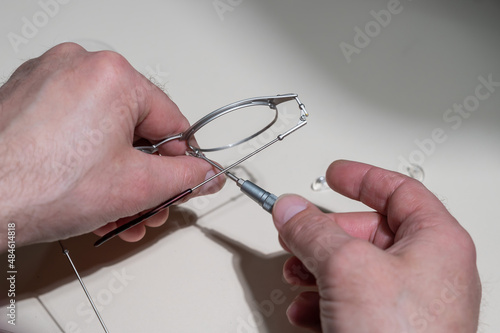 Installation of nose pads in glasses. A male technician repairs broken glasses