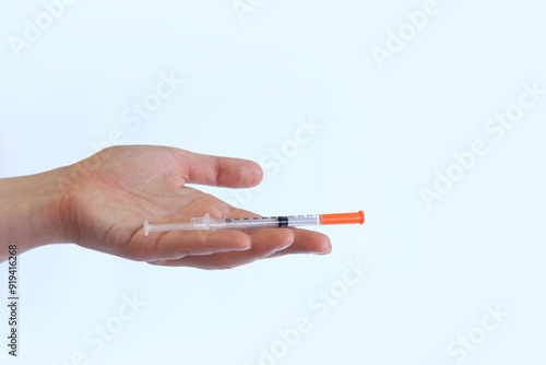 Insulin syringe. A woman's hand holds a syringe on a white background, close-up. Insulin syringe for diabetes. Diabetes treatment. Medicine and health concept