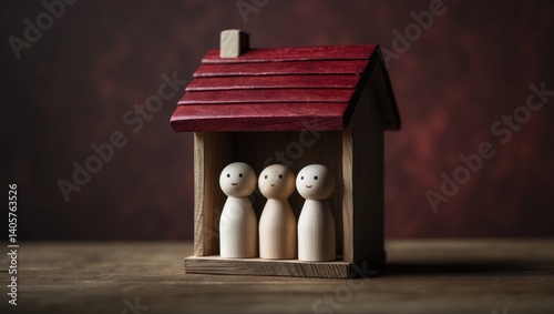 Insurance, care, and protection for families. Wooden dolls family situated inside a house.