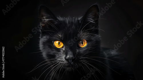 Intense Black Cat Portrait with Piercing Golden Eyes on Dark Background