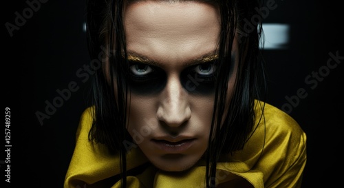 Intense portrait of a man with dramatic makeup and a yellow outfit