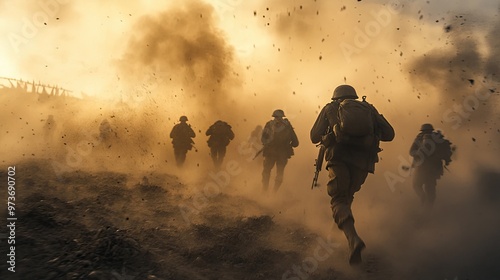 Intense scene of soldiers advancing through a battlefield, dust rising as they move in formation, prepared for combat.