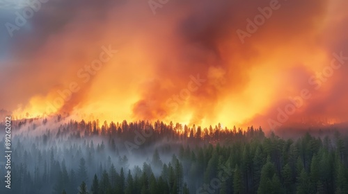 Intense wildfire burning through forest with thick smoke in the sky, showing the destructive force of nature and the impact on environment.