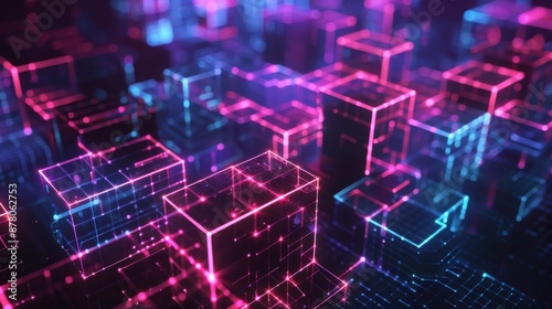 Interconnected neon pink and blue cubes in a 3D abstract design